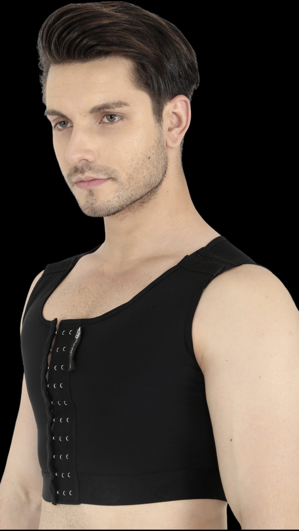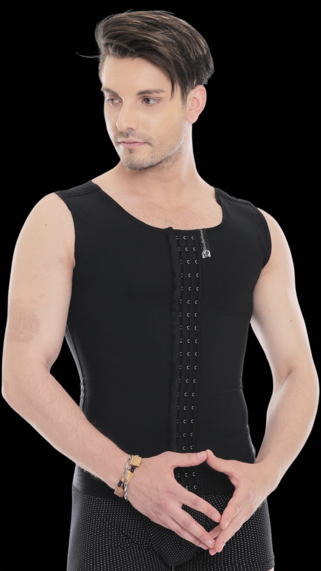 GA.Kompressionsweste für Gynäkomastie wird nach Brustrekonstruktionen beim Mann und Gynäkomastie-Operationen verwendet. Der vordere Klettverschluss der elastischen Kompressionsweste für Gynäkomastie sowie der Hakenverschluss an den Schultern ermöglichen eine bessere Anpassung der Kompressionsstärke, die zusätzliche Verstärkung im Brustbereich garantiert den richtigen Halt.